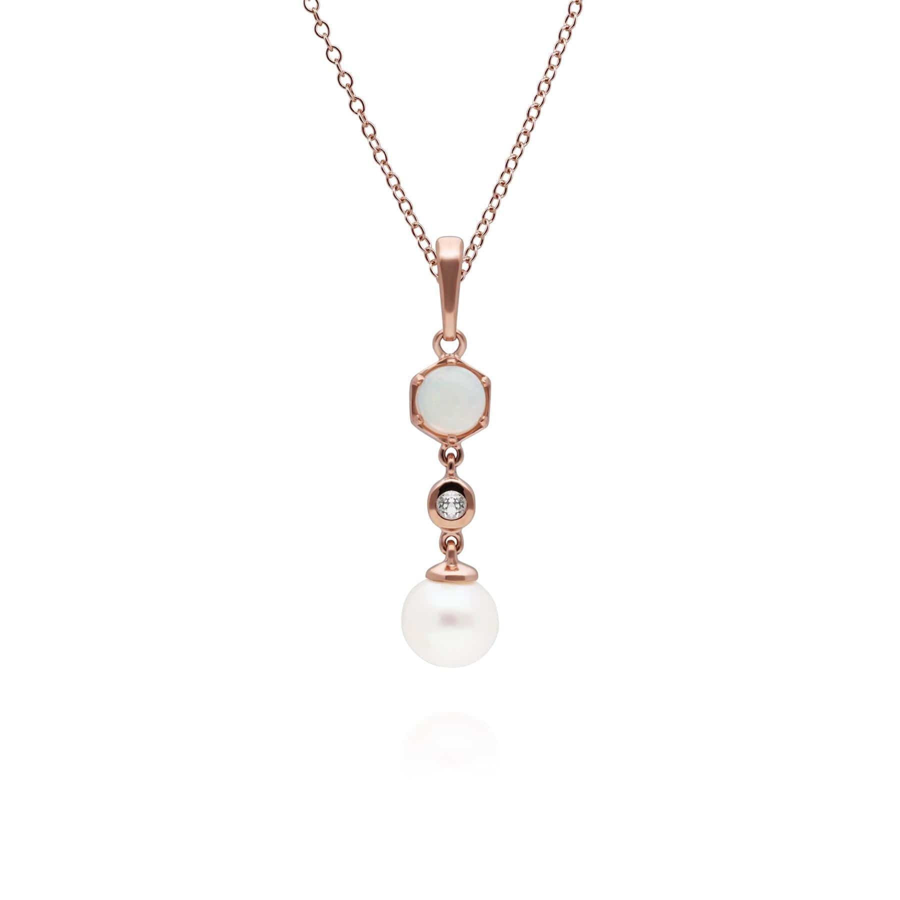 Ein schicker und zeitgemäßer Tropfenanhänger mit einer Süßwasserzuchtperle, die wunderschön an einer geometrischen Fassung baumelt, die mit Opal und weißem Topas verziert ist. Dieser Anhänger ist an einer passenden rosévergoldeten Sterlingsilberkette aufgehängt.