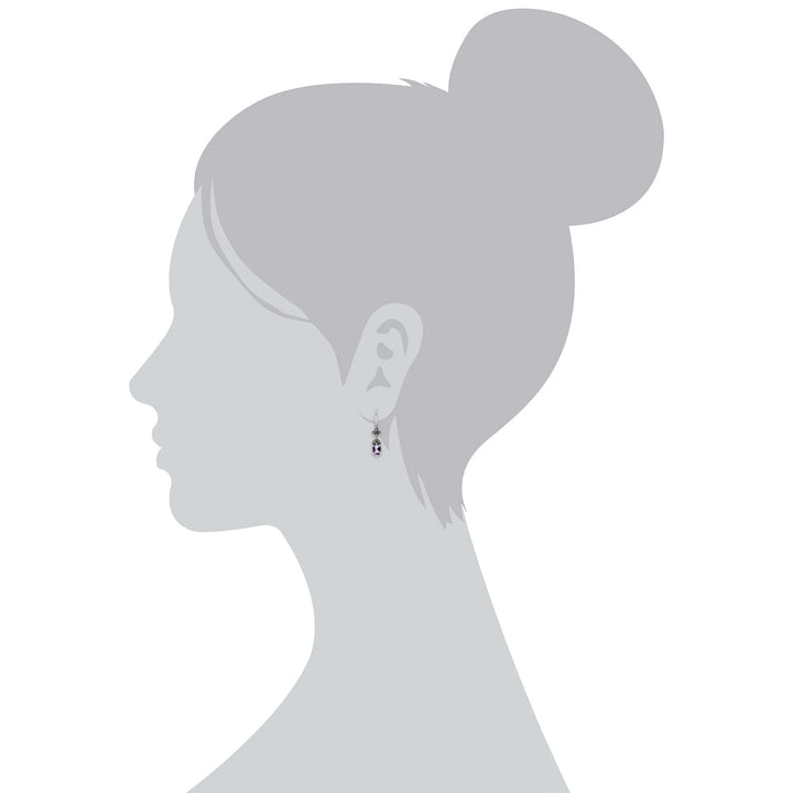 Ein beeindruckendes Paar Markasit-Ohrhänger aus Sterlingsilber, die einen ovalen Amethyst-Edelstein hervorheben, der von Markasit-Edelsteinen umgeben ist. Diese Ohrringe haben einen Stift und einen Schmetterlingsclip und sind nur für durchstochene Ohren geeignet.