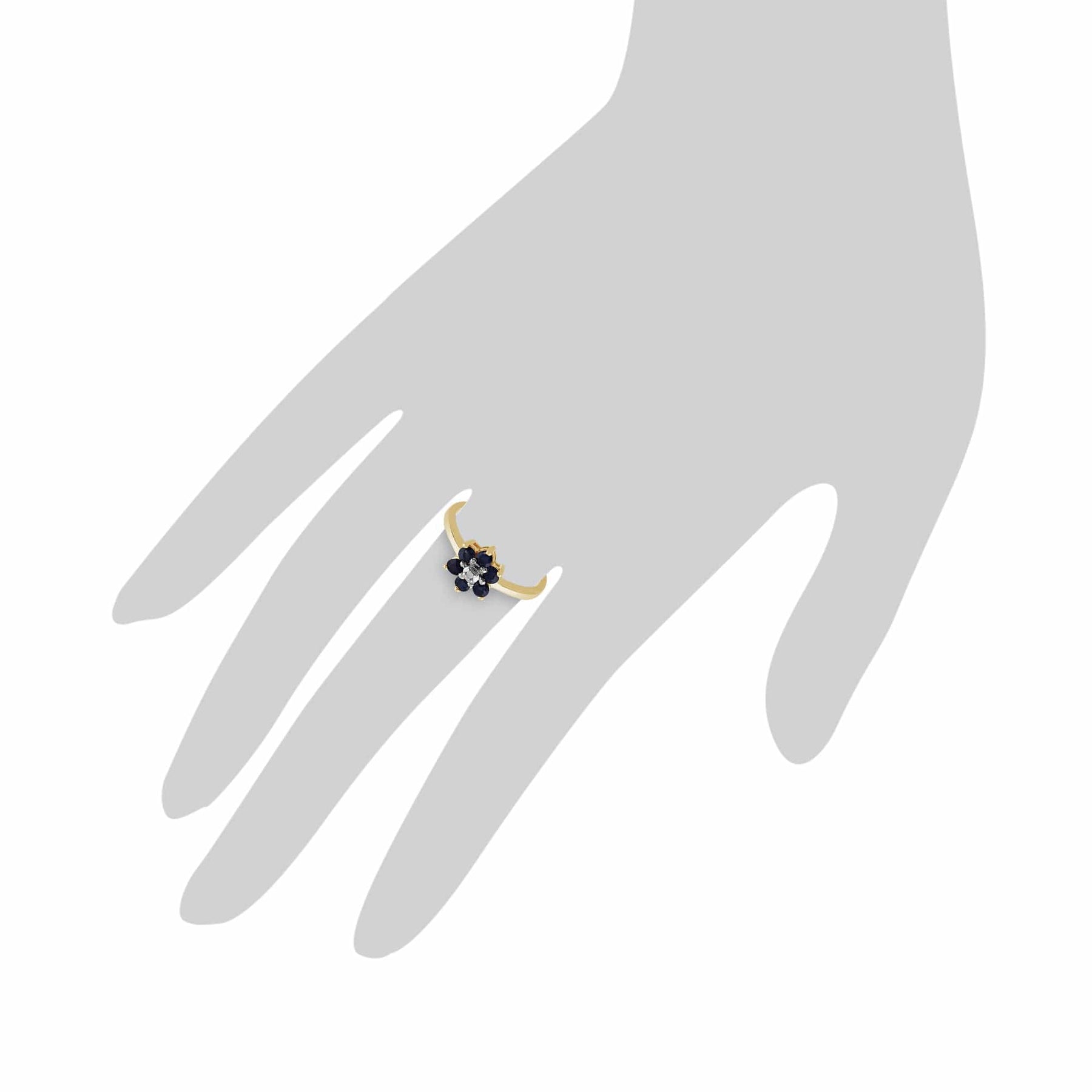 Ein atemberaubender Ring im klassischen Blumen-Cluster-Design aus 9 Karat Gelbgold, besetzt mit 6 facettierten blauen Saphir-Edelsteinen im Rundschliff um einen zentralen funkelnden weißen Diamanten