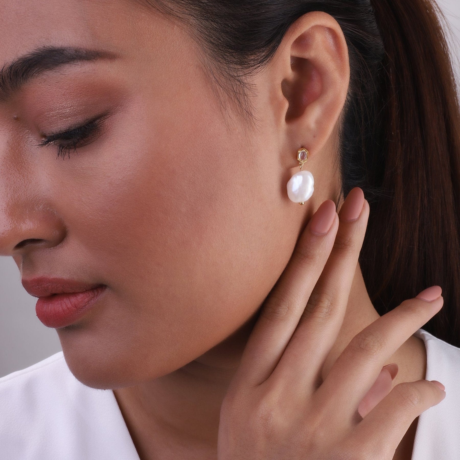 Ein elegantes Paar rosévergoldeter Sterlingsilber-Ohrhänger mit gezüchteten Süßwasser-Barockperlen, die unter milchigen Mondstein-Edelsteinen in eleganten sechseckigen Fassungen baumeln. Diese Ohrringe haben einen Stift und Schmetterlingsrücken und sind nur für durchstochene Ohren geeignet.