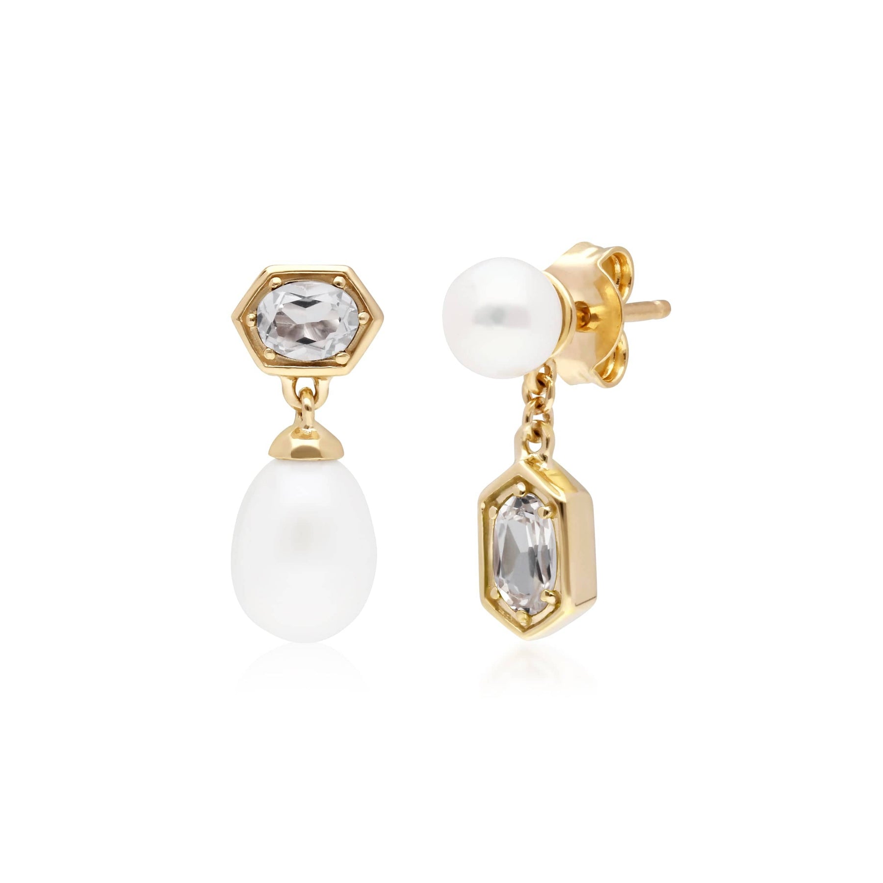 270E030209925 Modern Pearl & White Topaz Mismatched Drop Earrings in Gold Plated Silver 1