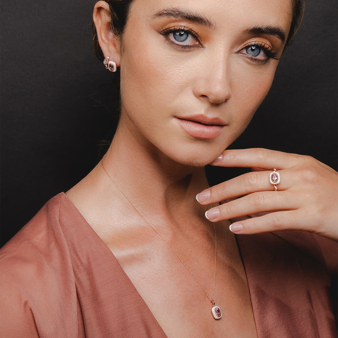 Tauchen Sie ein in die kinetischen Farben der Siberian Waltz Kollektion. Hier werden die Ästhetik atemberaubender russischer Architektur und die Opulenz zaristischer Juwelen in den filigranen Drehungen und Wendungen eines Schmucktanzes gewürdigt. Mit farbenfrohen Emaille-Details und leuchtenden Edelsteinen lädt diese Schmuckkollektion aus quadratischen Creolen, Stapelringen und mehrlagigen Anhängern zum Ball ein.