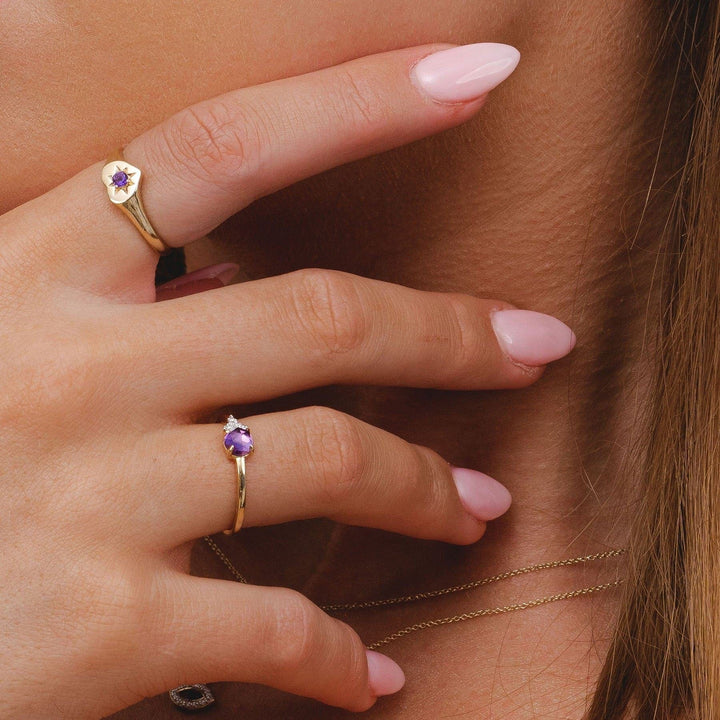 Ein beeindruckender Ring aus 9 Karat Gelbgold mit einem zentralen Amethyst im Rundschliff, der auf einer Seite von einem funkelnden Trilogie-Diamantmotiv akzentuiert wird.