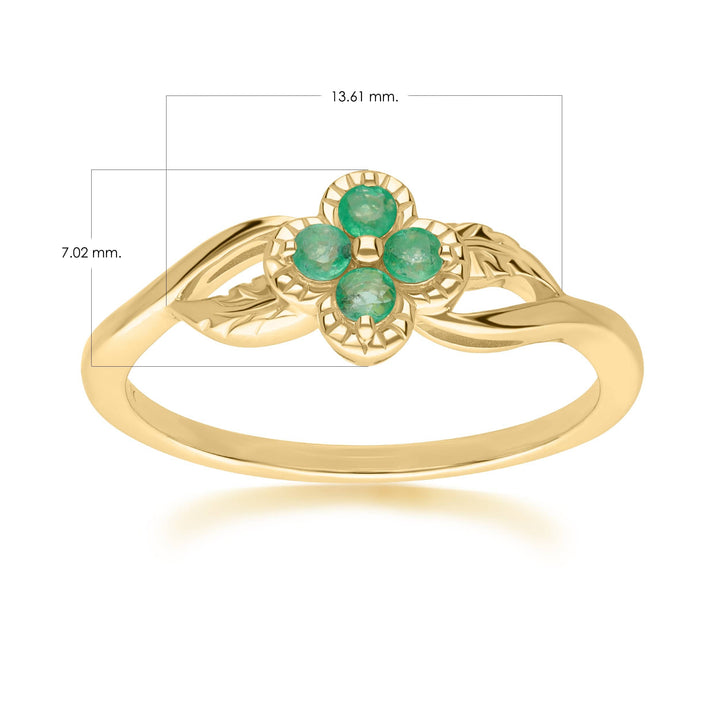 Dieser bezaubernde Blumenring ist von der Natur inspiriert und verfügt über vier Smaragde, die auf einem fünfzackigen Kopf sitzen. Das 9-karätige Gelbgoldband verfügt über ein detailliertes gewundenes Blattdesign, das die fließenden Bewegungen der freien Natur verkörpert.