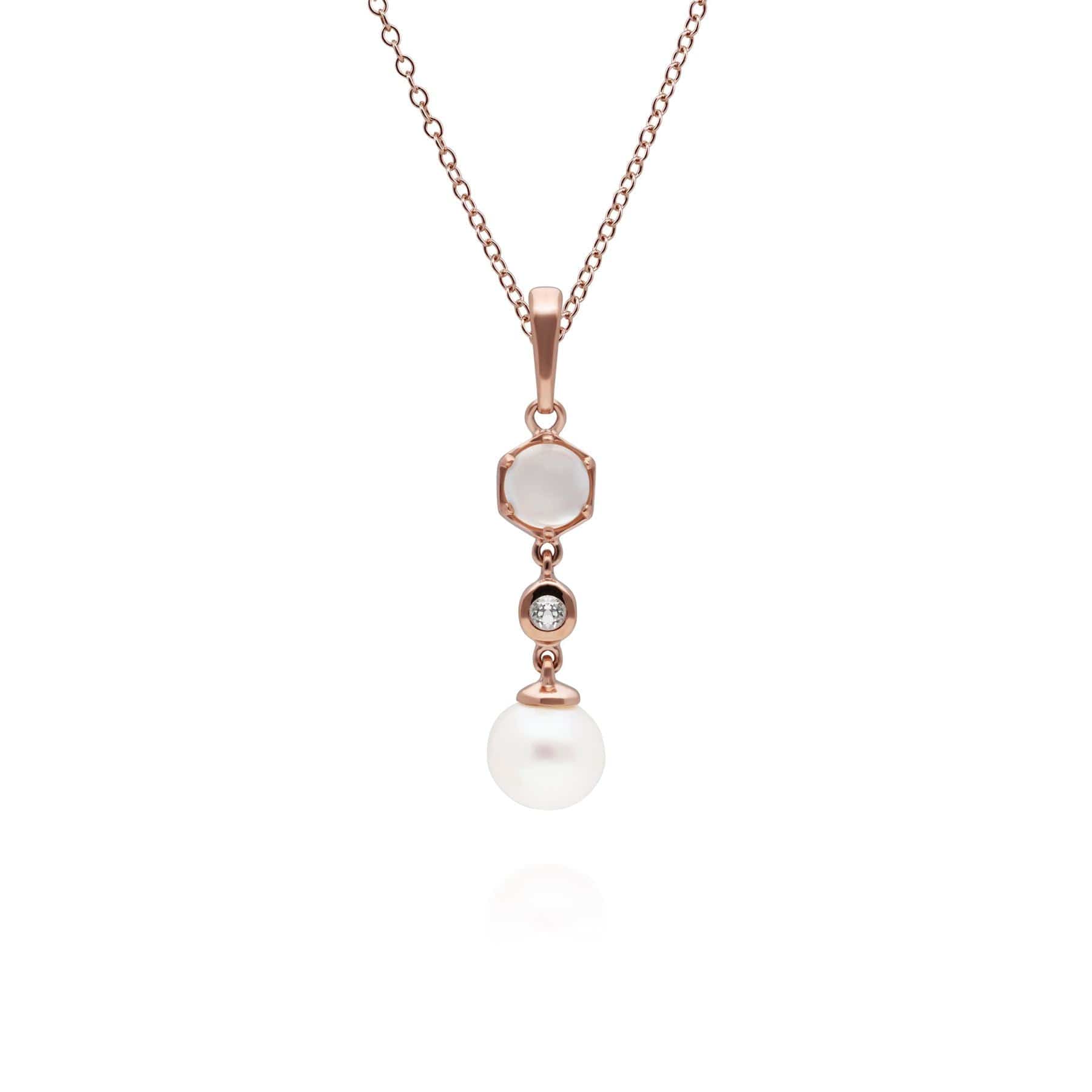 Ein schicker und zeitgemäßer Tropfenanhänger mit einer Süßwasserzuchtperle, die wunderschön an einer geometrischen Fassung baumelt, die mit Mondstein und weißem Topas verziert ist. Dieser Anhänger ist an einer passenden rosévergoldeten Sterlingsilberkette aufgehängt.