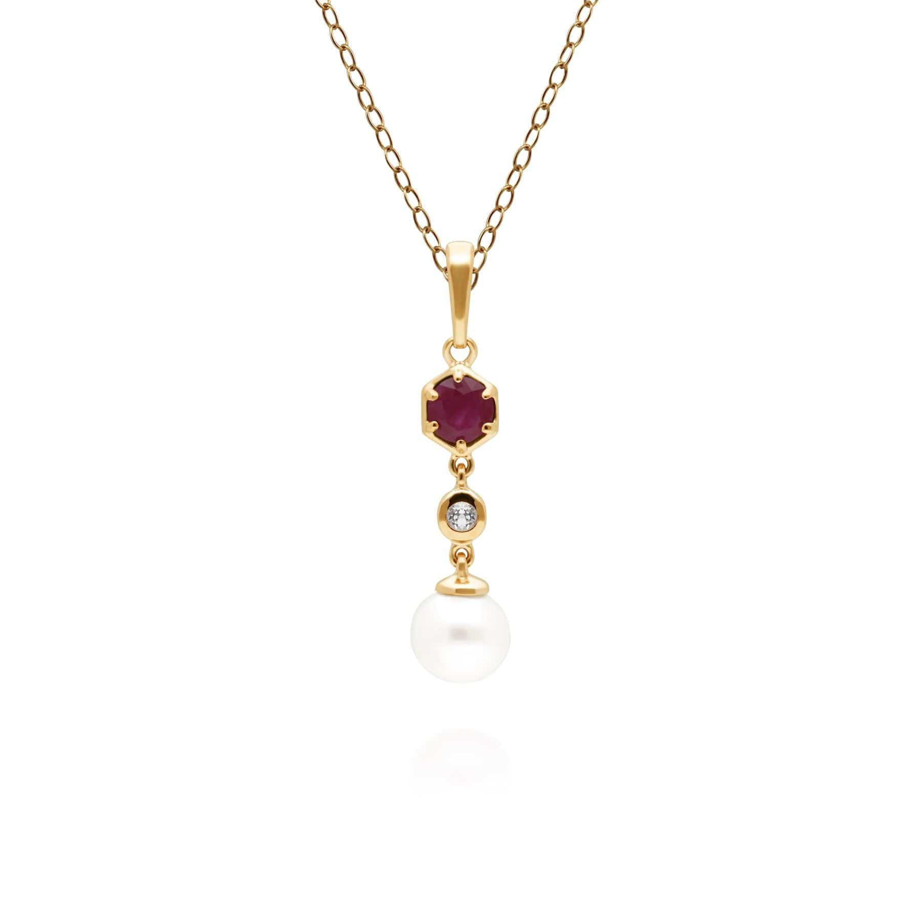 Ein schicker und zeitgemäßer Tropfenanhänger mit einer Süßwasserzuchtperle, die wunderschön an einer geometrischen Fassung baumelt, die mit einem roten Rubin und einem weißen Topas verziert ist. Dieser Anhänger ist an einer passenden gelbvergoldeten Sterlingsilberkette aufgehängt.