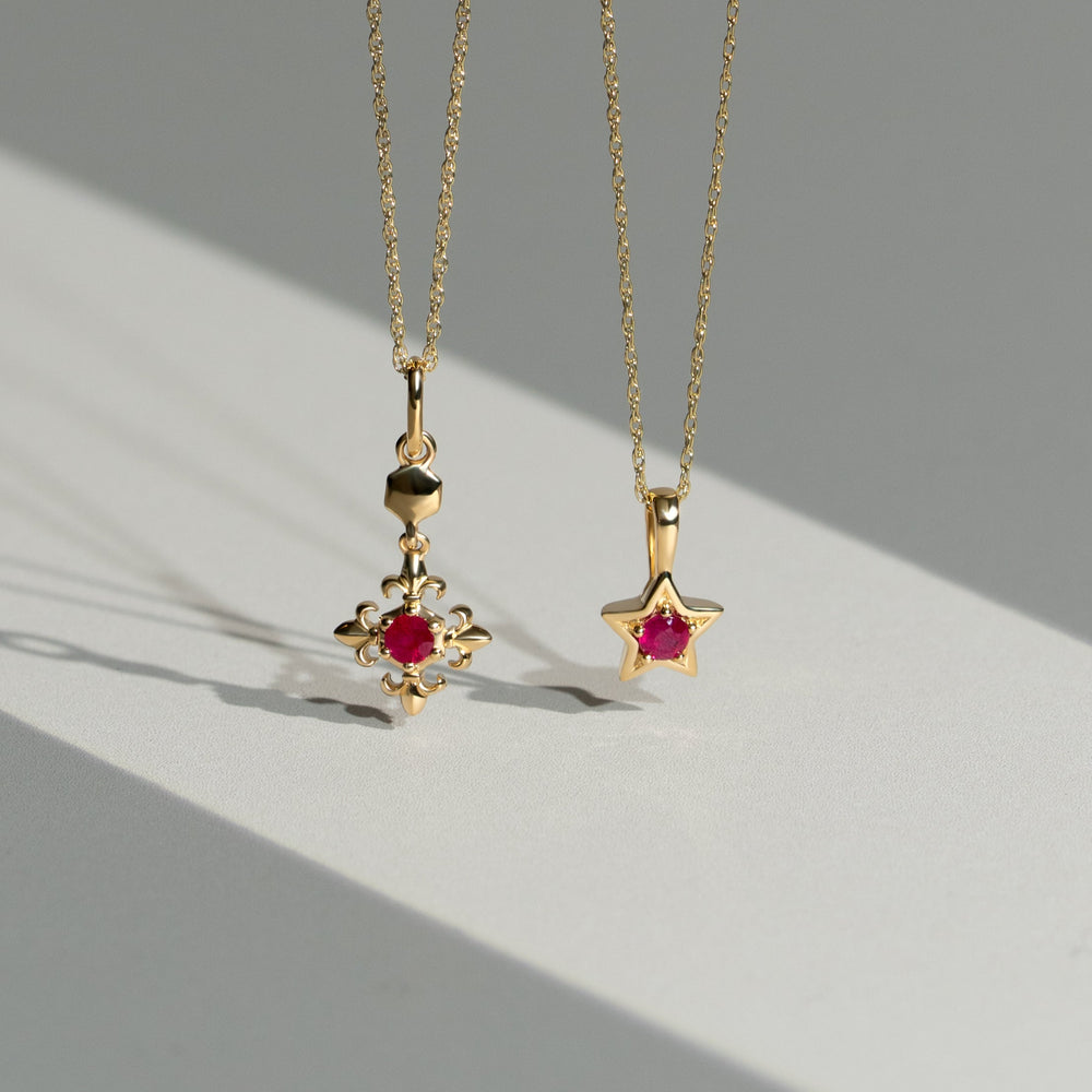 Eine niedliche sternförmige Halskette aus 9 Karat Gold, besetzt mit einem facettierten Rubin-Edelstein im Rundschliff in der Mitte.