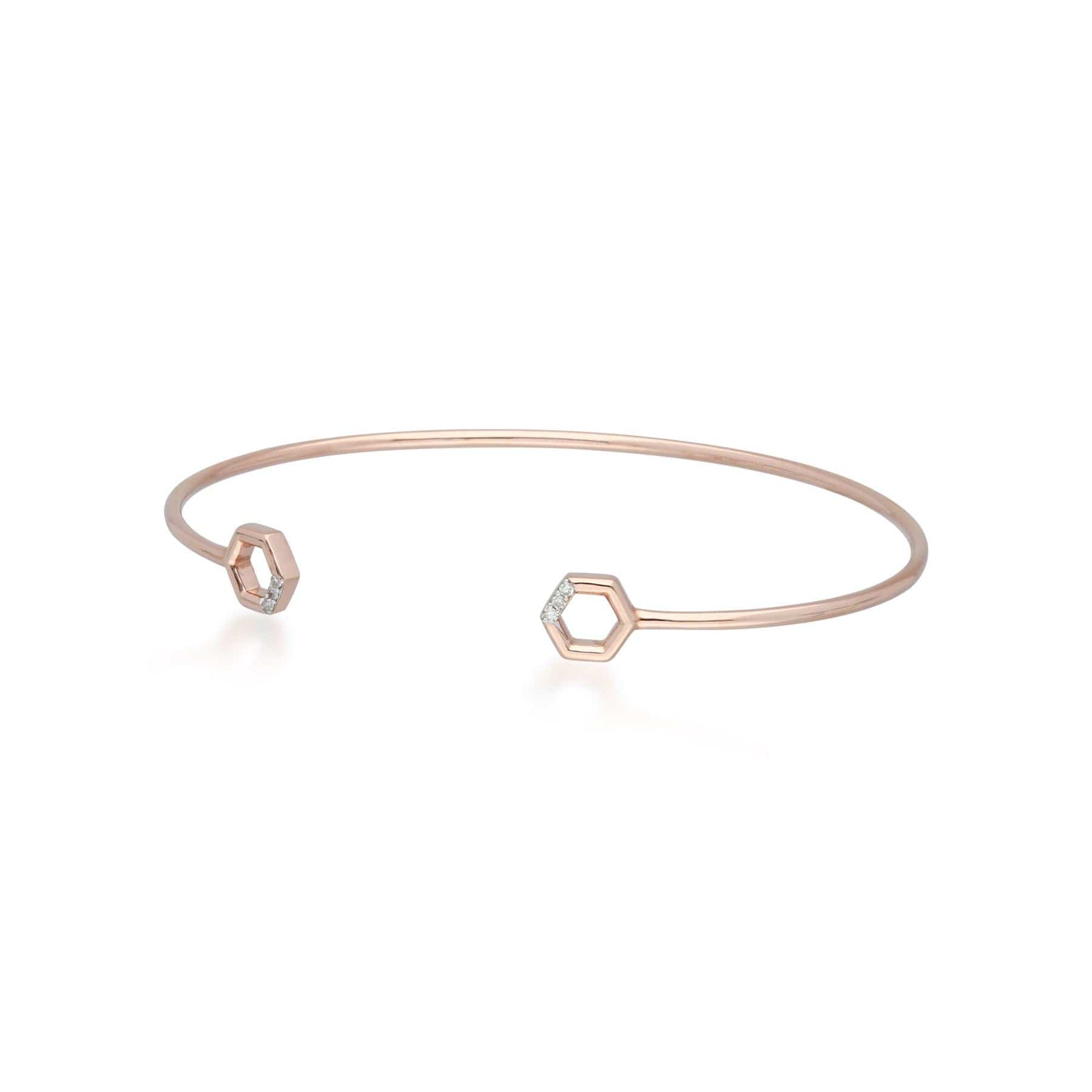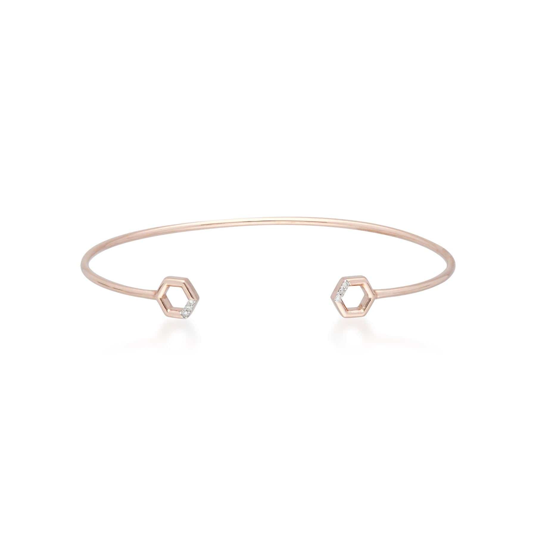 Ein eleganter und zarter Armreif aus 9 Karat Roségold mit offenen Sechsecken aus Diamantpavé. Kombinieren Sie ihn mit geometrischen Schmuckstücken aus der Diamond Collection von Gemondo, um den Look zu vervollständigen.