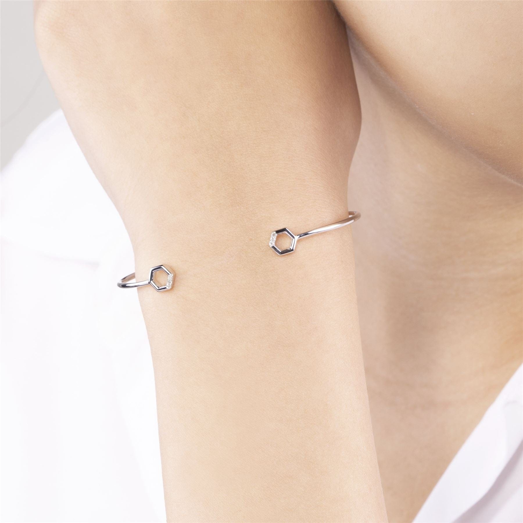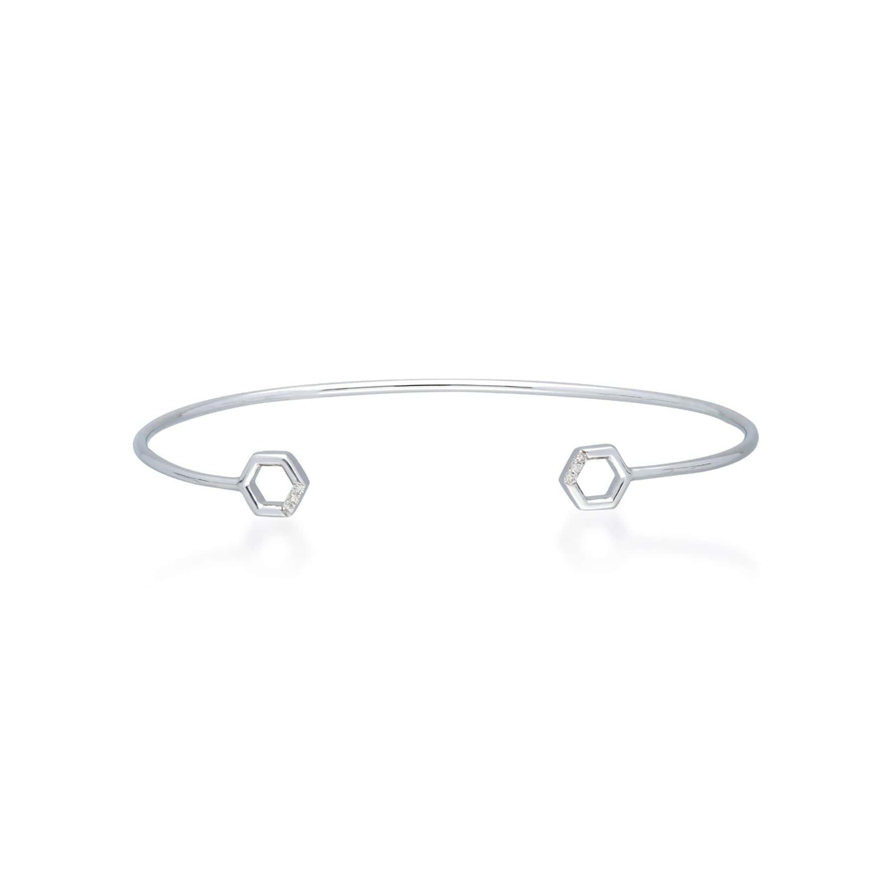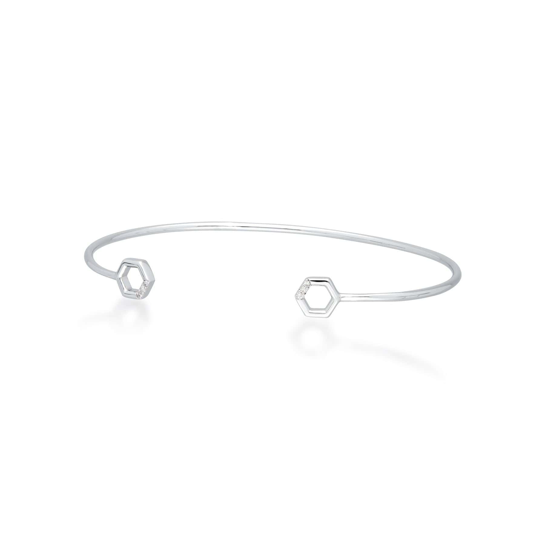 Ein eleganter und zarter Armreif aus 9 Karat Weißgold mit offenen Sechsecken aus Diamantpavé. Kombinieren Sie ihn mit geometrischen Schmuckstücken aus der Diamantkollektion von Gemondo, um den Look zu vervollständigen.
