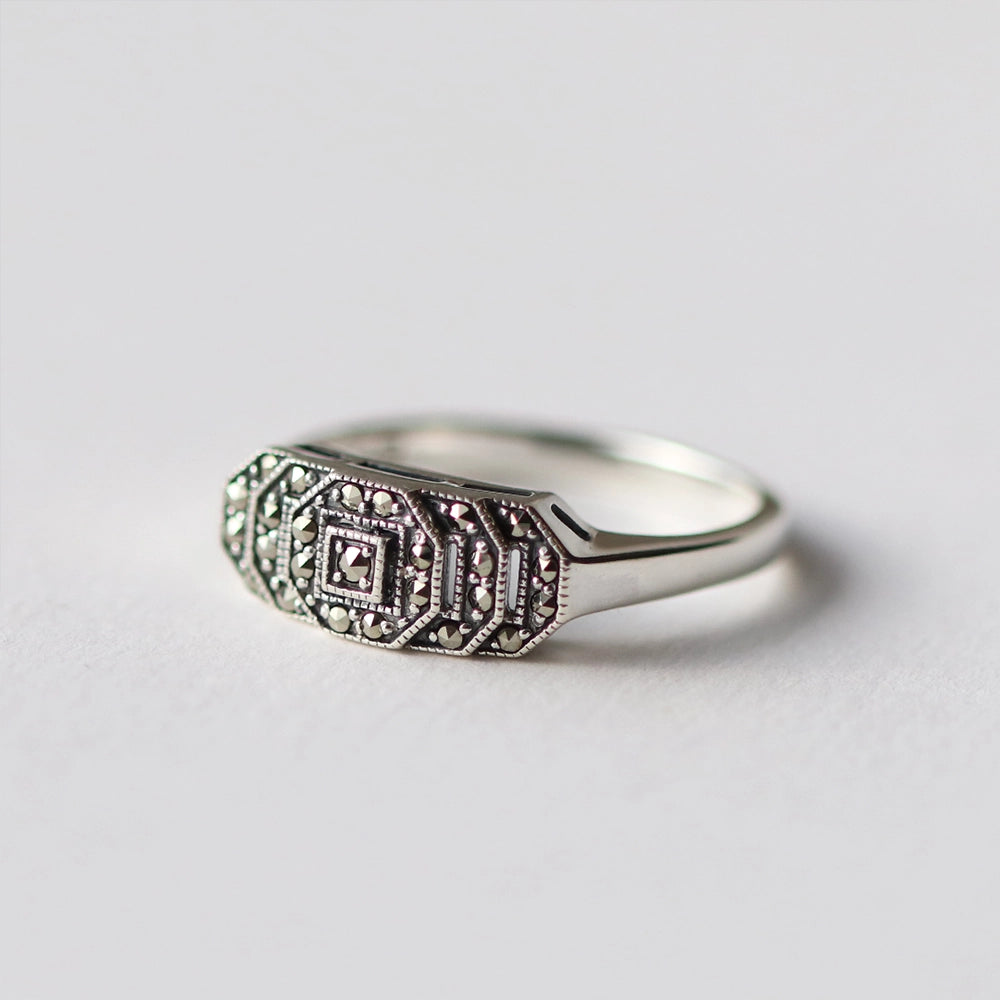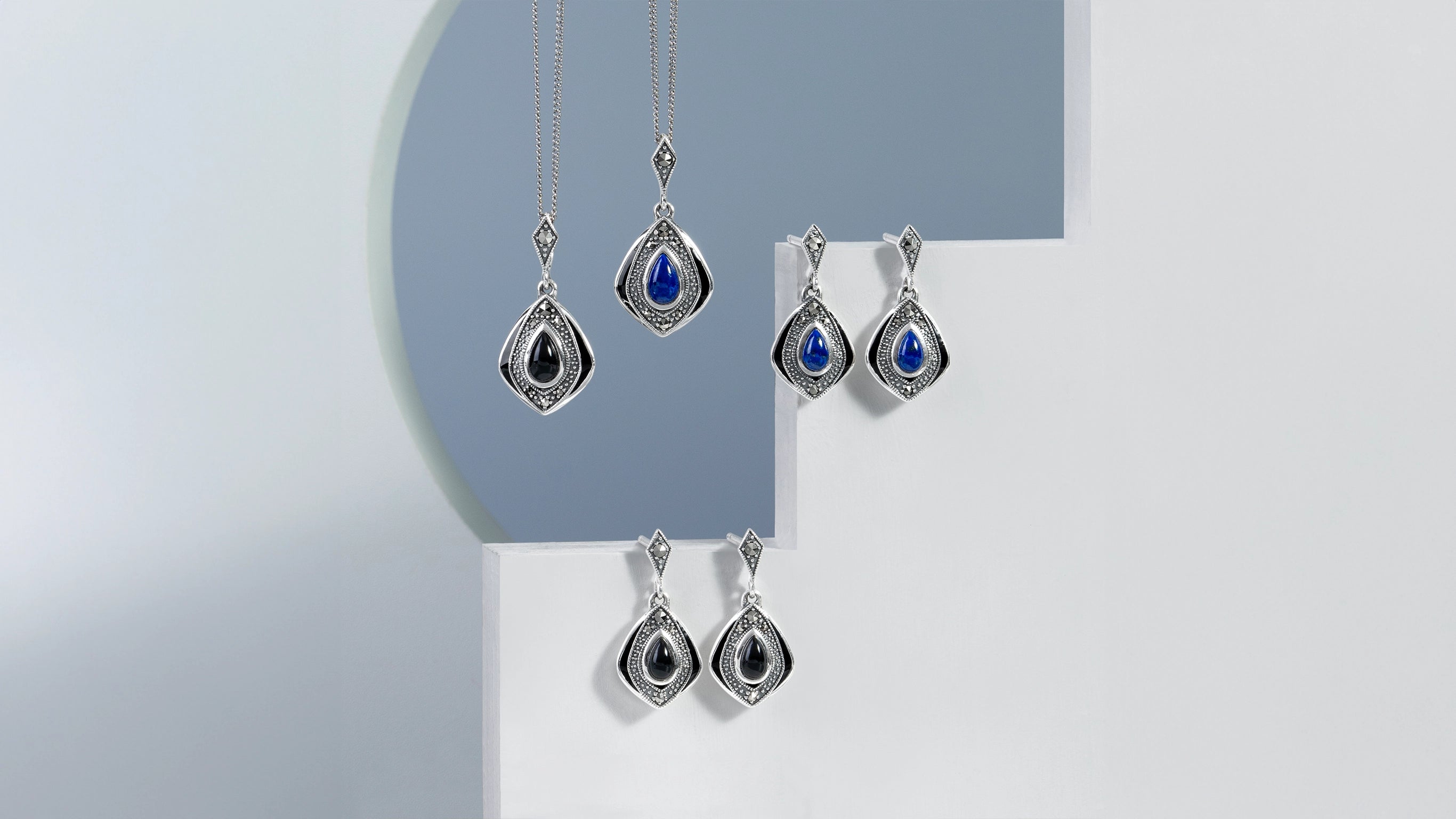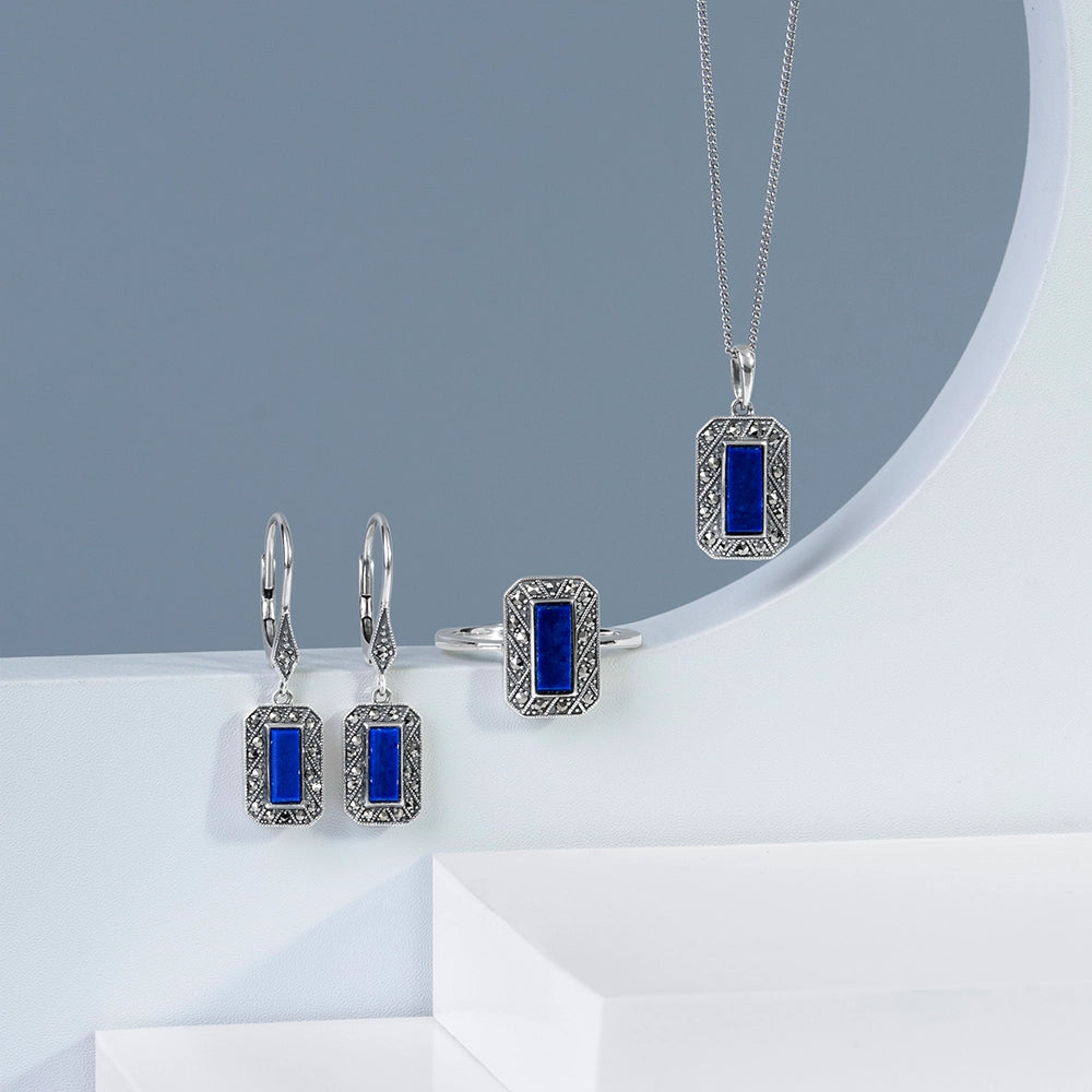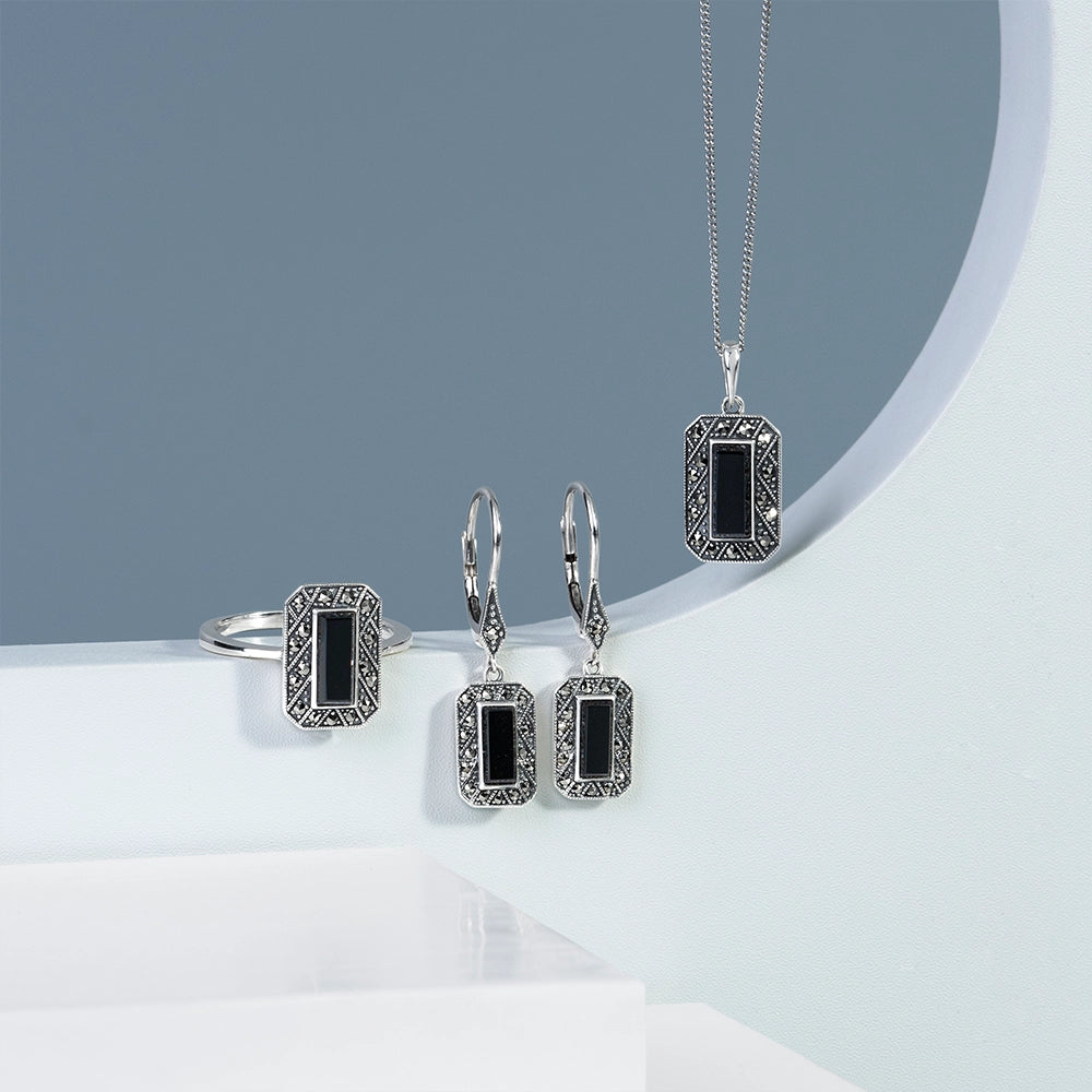 Inspiriert von ästhetisch Schönem und Kulturellem kombiniert unsere Art-Deco-Silberschmuckkollektion Sterlingsilber mit eckig geschliffenen Edelsteinen wie Onyx, Spinell, Markasit, Perlmutt und Lapislazuli. Mit kräftigen geometrischen Dreiecken, Quadraten, Kreisen und Bögen zielt jedes Design auf eine dekadente Art von Einfachheit ab.