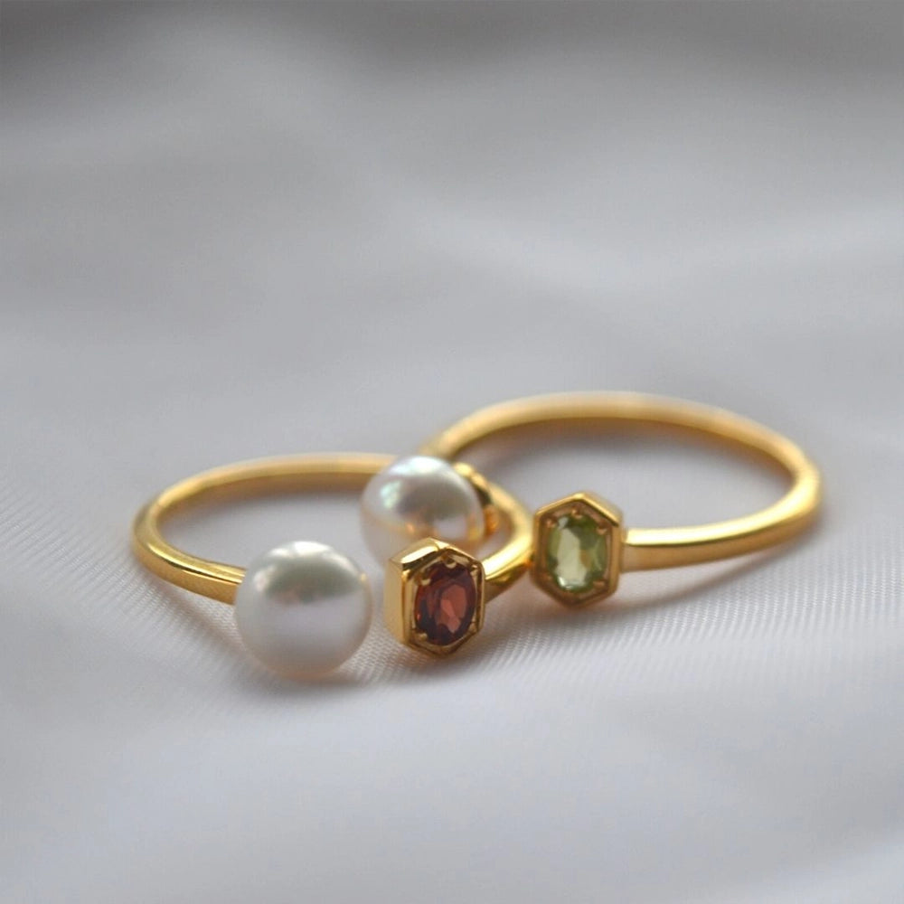 Elegante Stapelringe, die Perlen mit trendiger Metallverarbeitung kombinieren